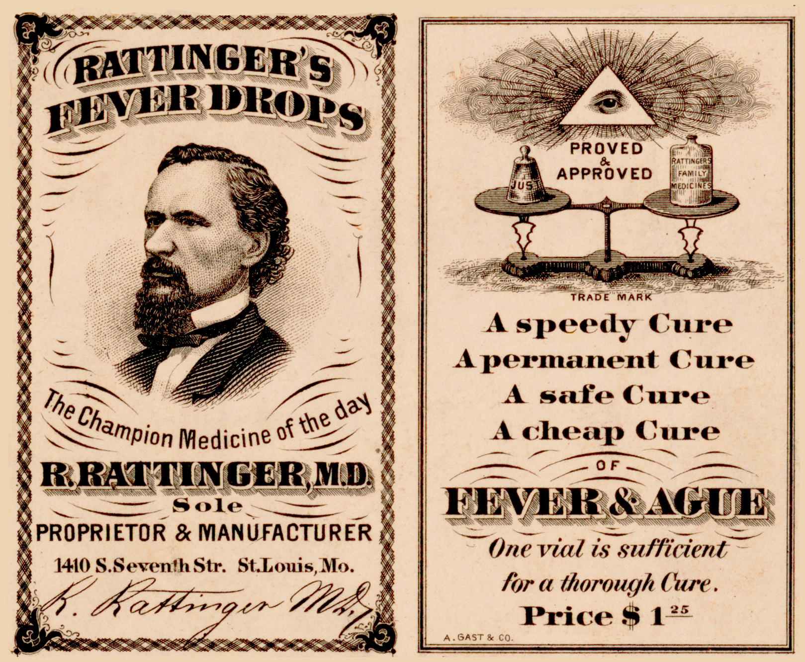 Dr. Rainer Rattinger’s Fever Drops Champion Medicine of the Day a Thorough Cure St. Louis Missouri Label