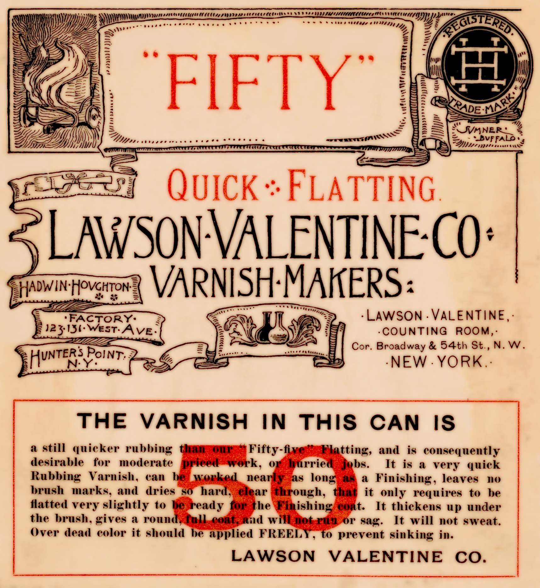 Hadwin-Houghton Factory’s Lawson Valentine Quick Flatting Fifty Varnish Hunter’s Point New York Label