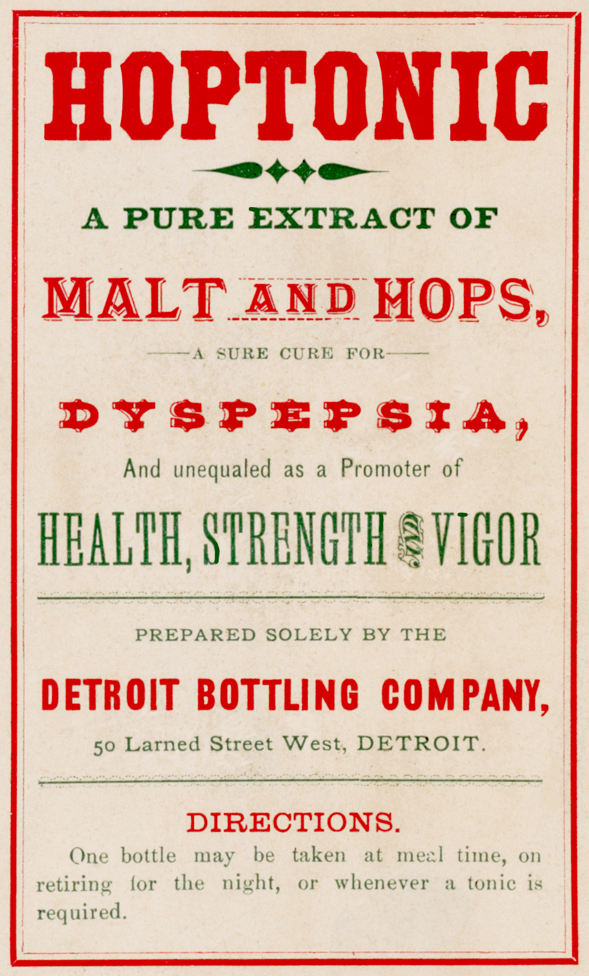 Hoptonic Pure Extract Malt and Hops Unequaled Promoter Of Health and Vigor Detroit Bottling Label