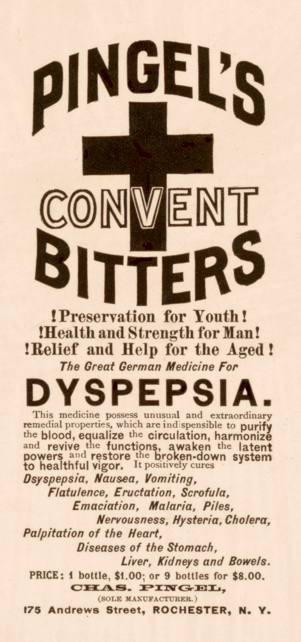 Pingel’s Convent Bitters Health and Strength for Man Cure for Flatulence Hysteria and Palpitation of Heart Rochester New York Label